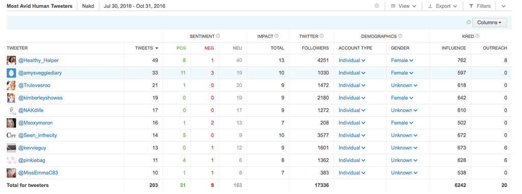Im obigen Nakd-Beispiel hat @Healthy_Helper in den letzten drei Monaten 49 Tweets versandt. Die nähere Untersuchung zeigt, dass es sich um den Twitter Account von Kaila handelt, eine bekannte Healthy-Living-Bloggerin, die dem Profil entspricht, das für das Influencer Marketing von Nakd nützlich sein könnte.