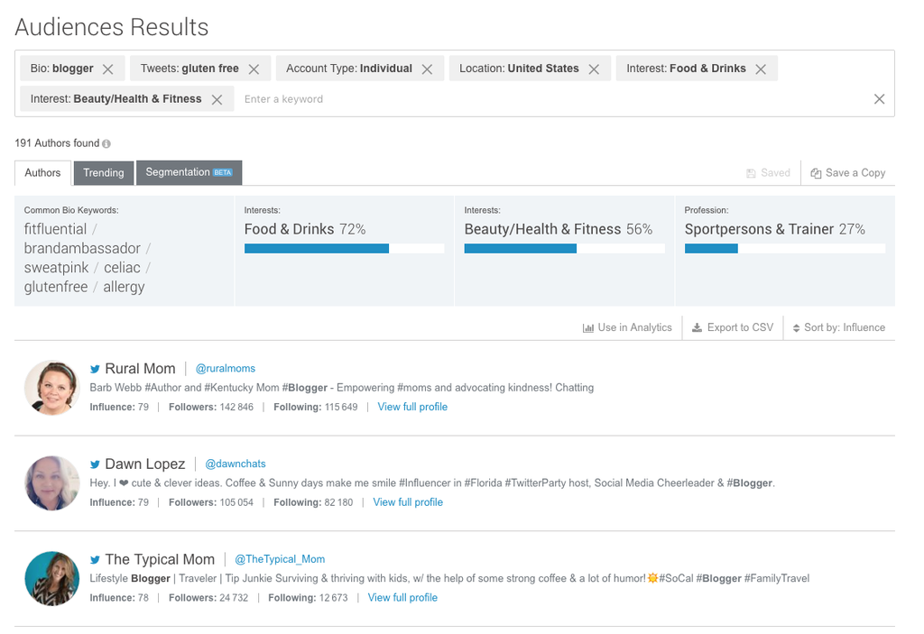 Unsere neue Publikumsanalyse-Plattform, Brandwatch Audiences, macht diese Art der Influencer-Suche zu einem Kinderspiel. Dank einer Datenbank mit mehr als 200 Millionen aktiven Twitter-Profilen, können Sie eine große Bandbreite an Suchbegriffen durchlaufen, um eine maßgeschneiderte Liste mit relevanten und einflussreichen Accounts zu erhalten.