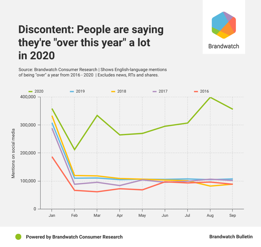 Zwischen März und September 2020 konnten wir 2,2 Mio. Erwähnungen finden, die „dieses Jahr satt haben“. Die meisten Erwähnungen gab es im August und September. Im Vergleich zu 2019 stiegen diese Erwähnungen um 195% an. Das zeigt einen großen Anstieg in den Gesprächen, die sich negativ über dieses Jahr äußern.