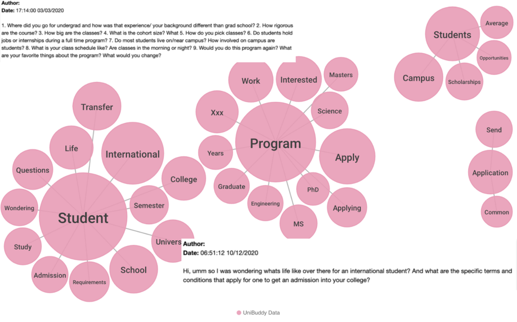 In den öffentlich zugänglichen Foren wird am häufigsten nach gefragt, an welchen Universitäten man sich bewerben sollte und wie andere Studierende die Chance einschätzen, an einer bestimmten Uni angenommen zu werden. Wir verglichen dann diese Erkenntnisse mit den Daten von Unibuddy, welche Einblicke in die anonymisierten Privatnachrichten zwischen angehenden Student:innen und Vertretern der Universitäten liefern. Hier fragten Interessierte vor allem nach Erfahrungen aus erster Hand rund um das Unileben.