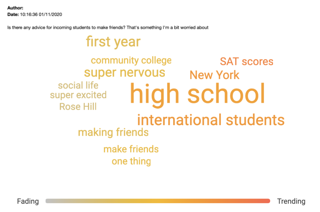 Eine Analyse beider Datensätze aus öffentlichen und privaten Gesprächen zeigt, dass sich die Top-Fragen um den Ablauf und Größe von Vorlesungen, Erfahrungen von internationalen Student:innen, Leben auf dem Campus und Finanzen drehen. Das sind Bereiche, über die Bewerbende informiert sein möchten, bevor sie ihre Entscheidung treffen.