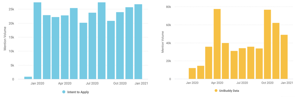 Da es sich hier nicht um einen traditionellen Kanal handelt, den Universitäten nutzen, gibt es eine Diskrepanz zwischen den Kanälen, die Universitäten nutzen, um Studierende anzusprechen und den Kanälen, die angehende Studierende nutzen, um über ihren Bewerbungsprozess zu reden. Universitäten müssen wissen, wie die Gespräche, die eine Bewerbungsabsicht äußern, aussehen und wo diese stattfinden, um Inhalte und Aktionen kreieren zu können, die bei der Zielgruppe wirklich Anklang finden.
