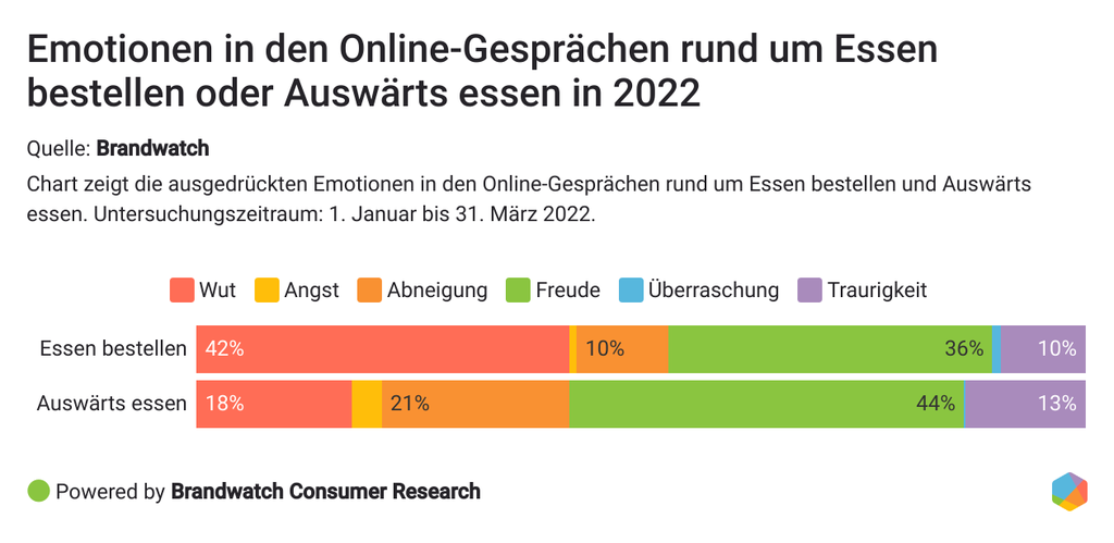 Fast die Hälfte der nach Emotionen kategorisierten Online-Erwähnungen beim Essengehen sind positiv, was zeigt, wie sehr das Essen bei den Kund:innen Freude auslöst. Vom Hinterlassen einer positiven Bewertung bis hin zum Teilen von Fotos ihres Erlebnisses - die Verbraucher:innen teilen gerne ihre letzten Ausflüge.
