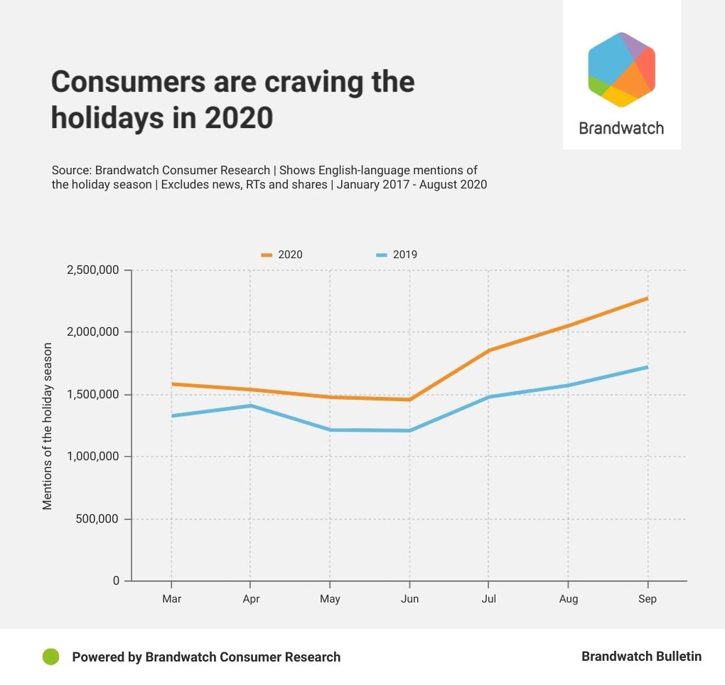 Wenn wir uns Erwähnungen seit März über die Feiertage betrachten, können wir sehen, dass Verbraucher sehr beschäftigt mit der Planung der Festlichkeiten sind. Einige haben sogar schon angefangen Geschenke zu kaufen.