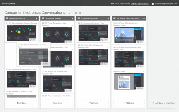 Bauen Sie die Scene, indem Sie Datenquellen (die Sie in Brandwatch Analytics angelegt haben) auswählen, sowie Filter und einen Datenzeitraum hinzufügen. Die Scene Preview zeigt Live-Daten und berücksichtigt jegliche Änderungen sofort.
