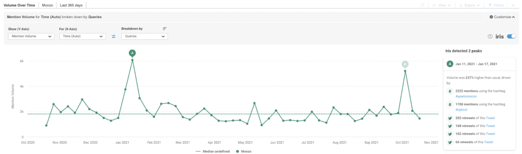Richard hatte eine ziemlich gute Vorstellung davon, dass diese Kampagne Buzz erzeugte, aber sein Team konnte es nie ganz quantifizieren. Visualisiert auf einem Brandwatch Dashboard konnte sein Team deutlich sehen, dass das Jahr von Monzo die meisten Gespräche generiert, die die Marke jedes Jahr sieht.