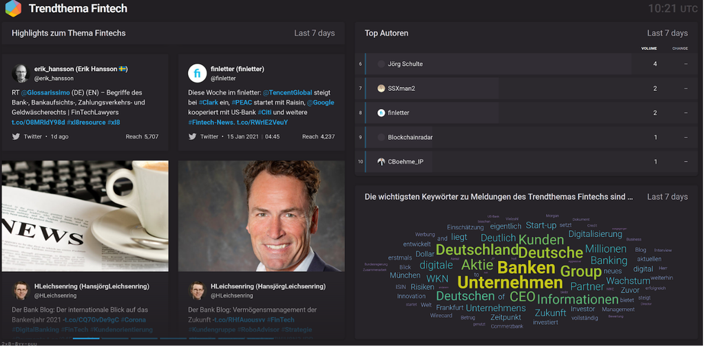 Ein weiterer Schwerpunkt des Live-Monitoring liegt in der Beobachtung zukünftiger Trends. So hat das Team um Julian Suchanfragen zu Themen wie Fintechs und IT-Sicherheit angelegt. Diese Themen wurden ausgewählt, da sie den Banken Trends in der Bankenbranche aufzeigen können. Neben den wichtigsten Meldungen zum Thema Fintechs werden die Top Autoren und die wichtigsten Keywords gelistet.