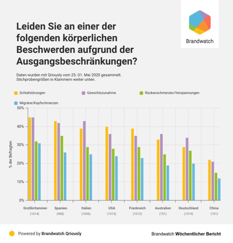 Befragte aus China leiden von allen Befragten am wenigsten an gesundheitlichen Beschwerden. Das könnte daran liegen, dass das Land keinen nationalen Lockdown hat und viele Maßnahmen schon vor einer Weile aufgehoben wurden. In Wuhan zum Beispiel wurden die Ausgangsbeschränkungen vor fast zwei Monaten aufgehoben.