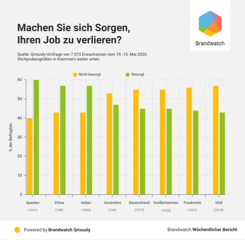 Spanien, China und Italien machen sich mit 60%, 57%, und 57% der Befragten am meisten Sorgen um ihre Jobs.
