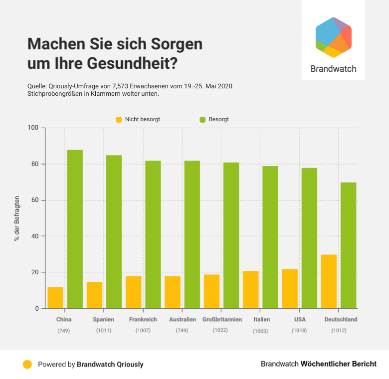 Mit Brandwatch Qriously wollten wir herausfinden, worüber sich Menschen in Bezug auf Covid-19 Sorgen machen. Dazu befragten wir 7.573 Erwachsene aus Australien, China, Deutschland, Frankreich, Großbritannien, Italien, Spanien und den USA via Smartphones und Tablets.