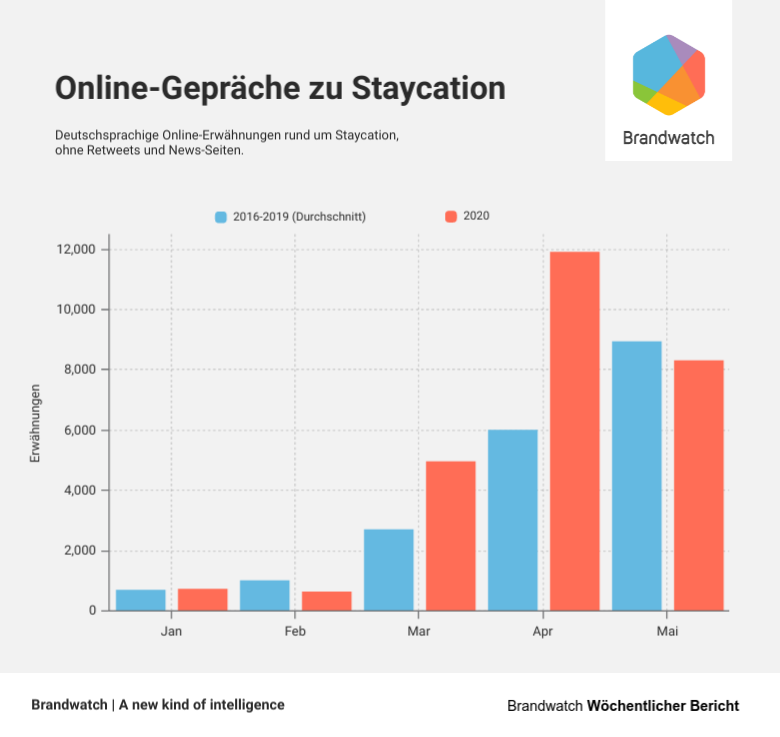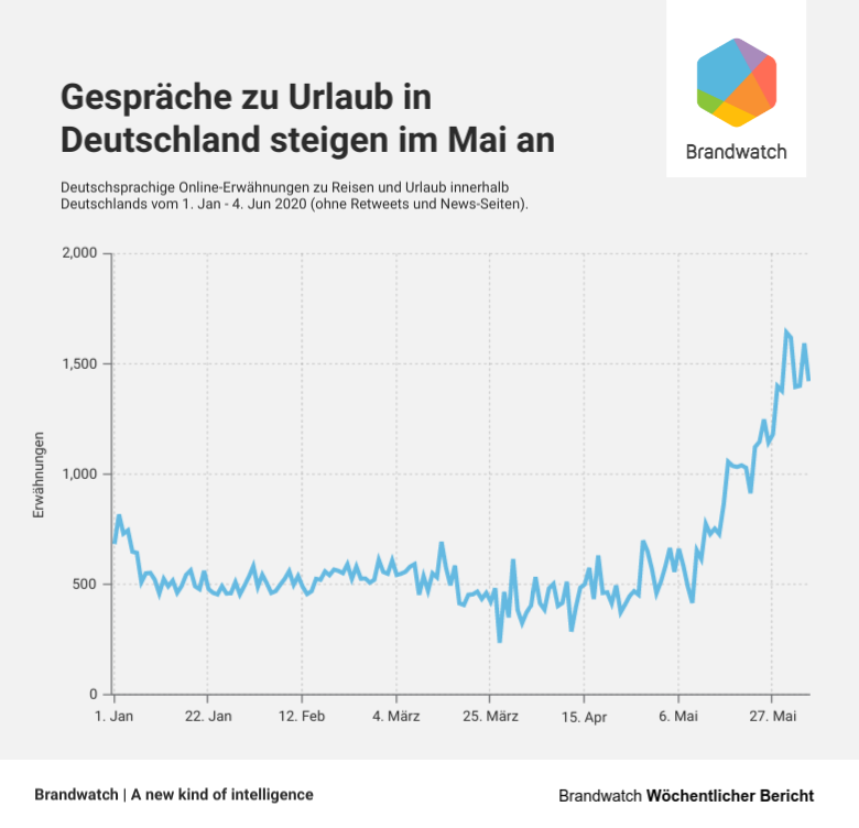 Ein Blick auf die Online-Gespräche bestätigt diesen Trend. Erwähnungen rund um Urlaub und Verreisen innerhalb Deutschlands stiegen seit Mitte Mai stark an mit Gesprächsspitzen am Pfingstwochenende.