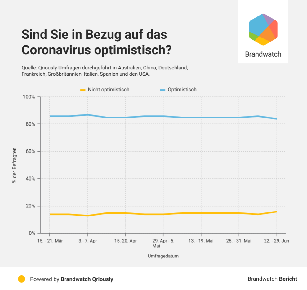 Diese beiden Ländern haben, neben den USA, mehr Befragte, die angaben, gar nicht optimistisch zu sein, als Befragte, die sehr optimistisch sind. Auch wenn diese beiden Gruppen (jene, die sehr optimistisch sind und jene, die nicht optimistisch sind) nur ein Drittel der Befragten in diesen Ländern ausmachen, könnten die Daten einen Hinweis darauf liefern, dass die Bevölkerung in diesen Ländern Probleme hat, eine optimistische Haltung aufrecht zu erhalten, je länger die Pandemie andauert.