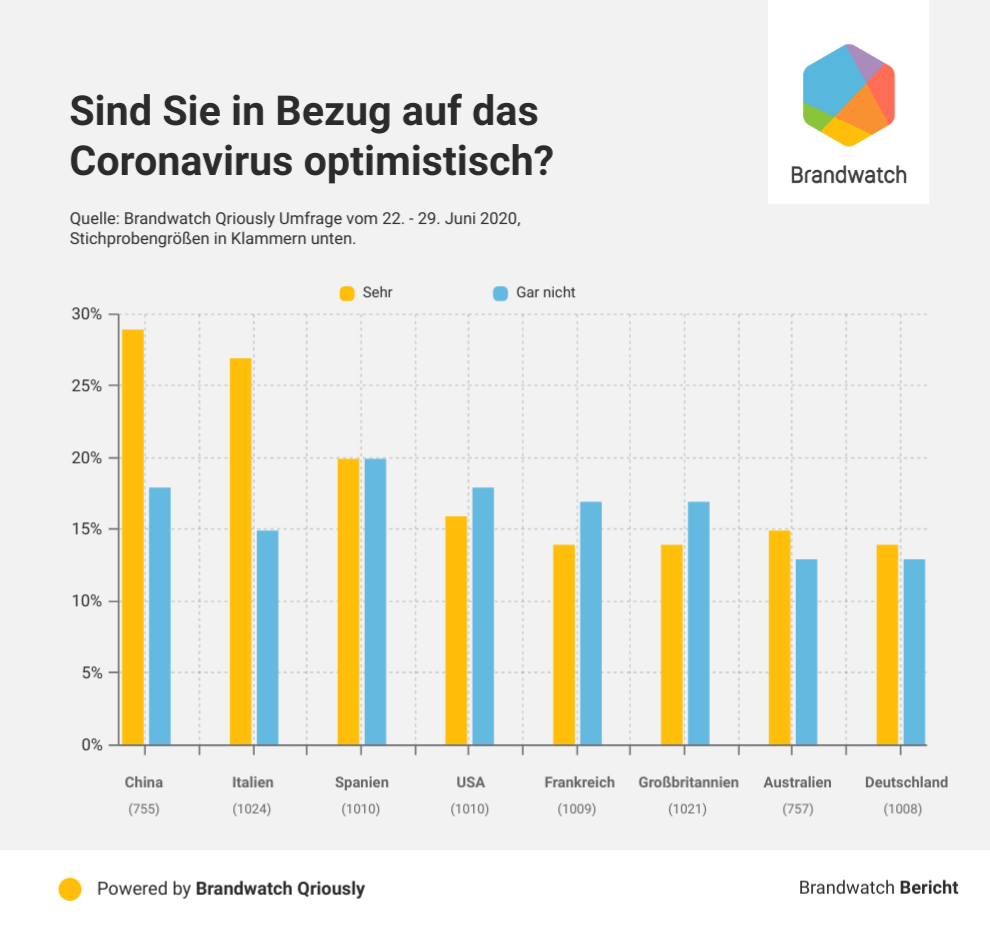 In China und Italien sind die Befragten im Vergleich optimistischer. 29% und 27% der Befragten gaben hier an, dass sie in Bezug auf die Pandemie sehr optimistisch sind. Bei den Befragten aus Frankreich und Großbritannien liegen diese nur bei 14%.