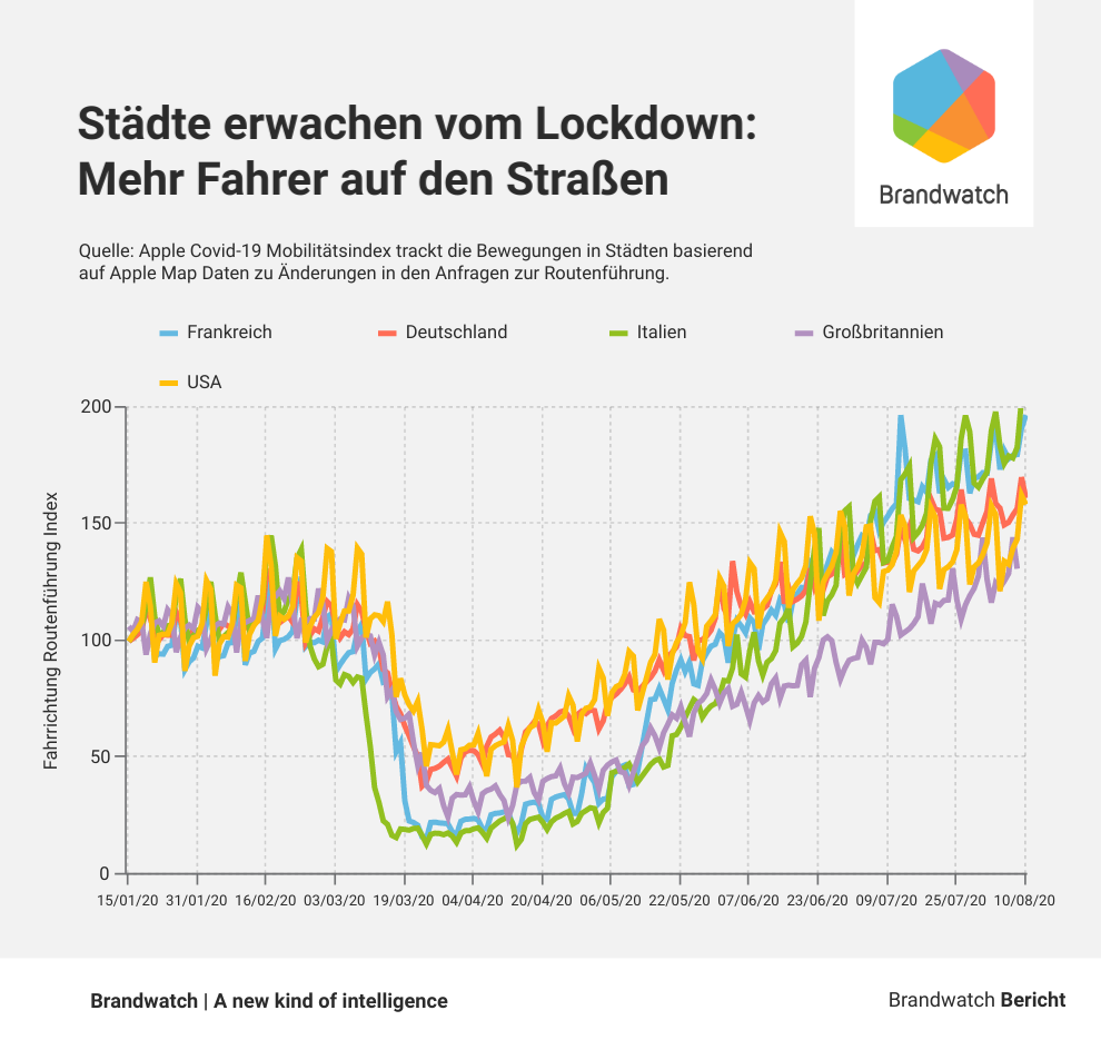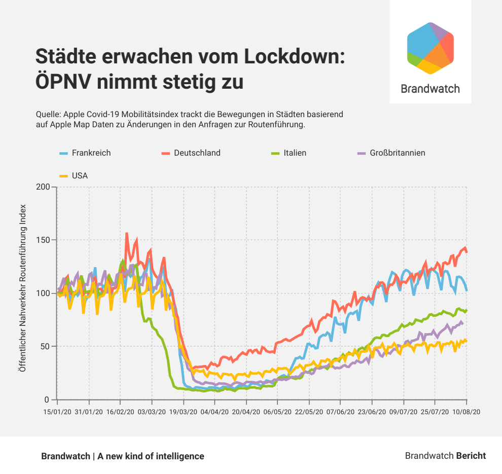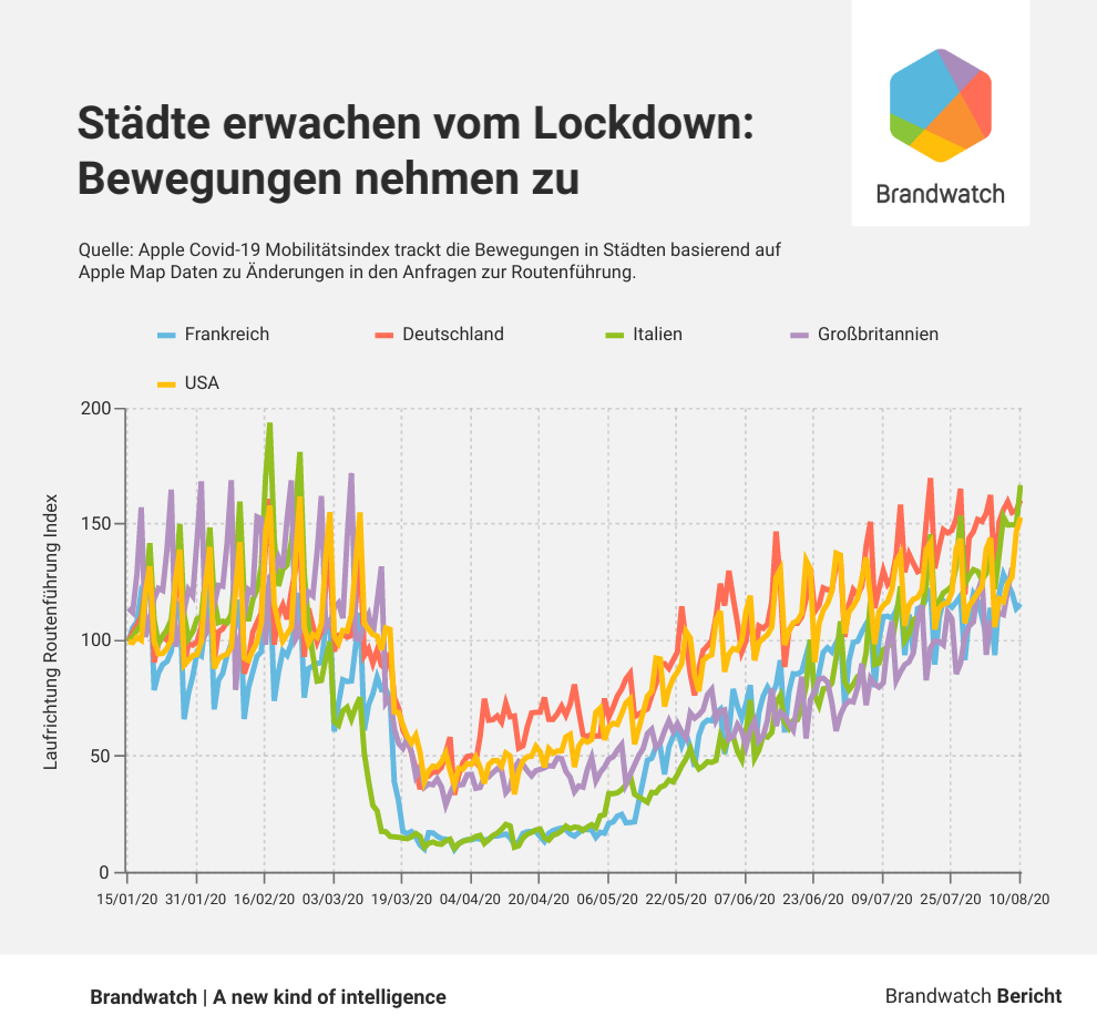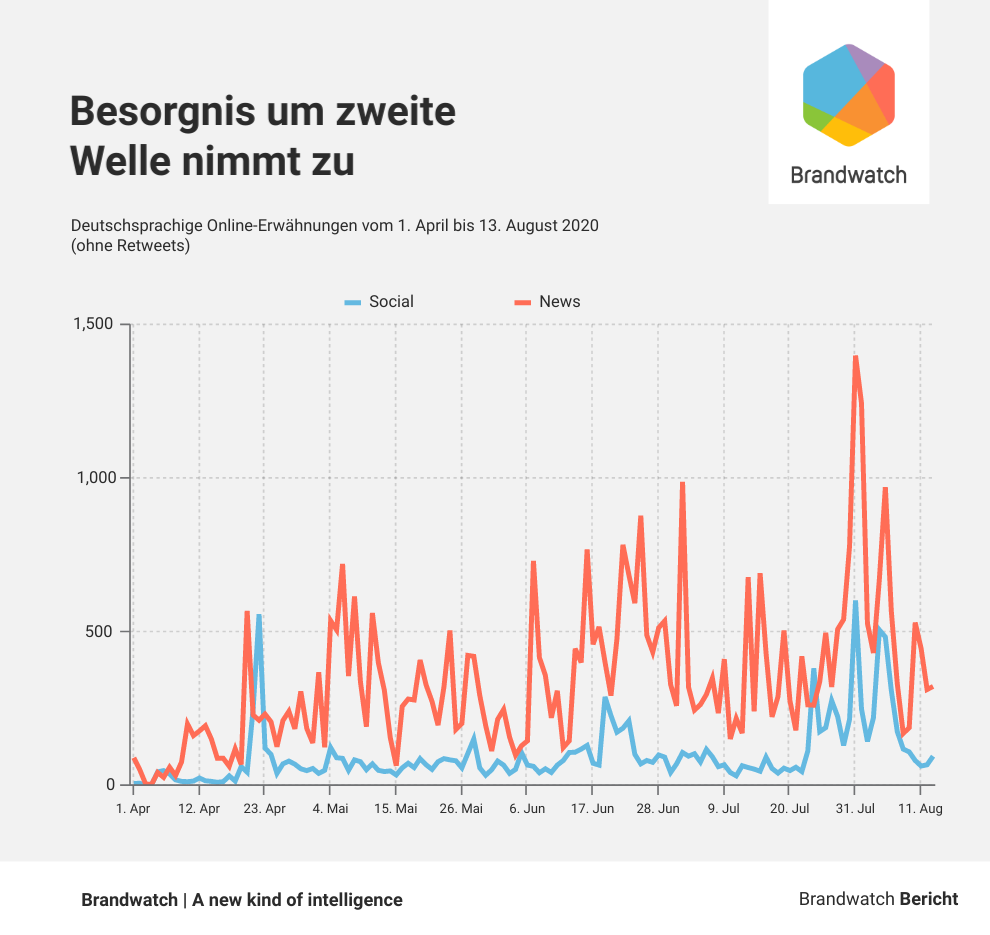 Während das Interesse an der zweiten Welle auf Social Media Ende April abflaute, zeigt ein Blick auf Google Trends, dass das Suchinteresse dazu seit Mitte April zunimmt und Ende Juli den bisher höchsten Peak erreichte.