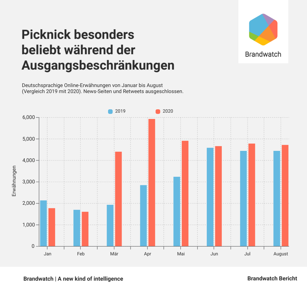 Mithilfe unserer Consumer Research Plattform untersuchten wir öffentlich zugängliche Online-Erwähnungen in deutscher Sprache rund um das Thema Picknicken. Im Folgenden verglichen wir die Mentions von Januar bis August 2020 mit denen vom Vorjahr.