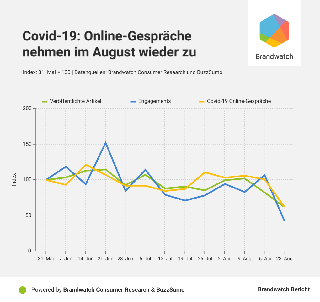 Bei den Online-Gesprächen zeigt sich allerdings, dass das Interesse wieder zugenommen hat. Sanken die Erwähnungen ab Mitte Juni, nahmen diese ab Ende Juli wieder zu. Häufig erwähnt in den Gesprächen wurde die Maskenpflicht, Hygienemaßnahmen in Schulen, die Corona-Warn-App, eine mögliche zweite Welle und Demos gegen die Maskenpflicht. Die Webseite der Bundesregierung, die aktuelle Informationen zu Covid-19 veröffentlicht, war die Seite, die von Anfang Juni bis Ende August am häufigsten auf Twitter geteilt wurde. Der Twitter Account von Karl Lauterbach wurde im Untersuchungszeitraum am häufigsten erwähnt. Artikel, die im August geteilt wurden, stammen vor allem vom Spiegel, der BILD und dem Satiremagazin Der Postillon.