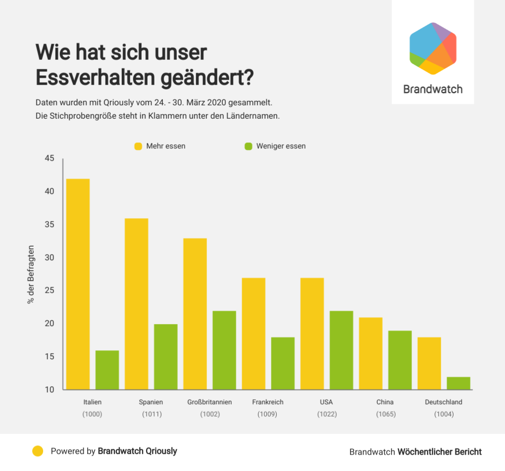 Im Vergleich zur Umfrage in der Vorwoche gaben sowohl Befragte in Italien als auch Großbritannien wesentlich häufiger an, mehr zu essen. Bei den Umfrageteilnehmern aus Italien stiegen die Antworten von 36% auf 42% an, während bei den Befragten aus Großbritannien der Wert von 23% auf 33% anstieg.