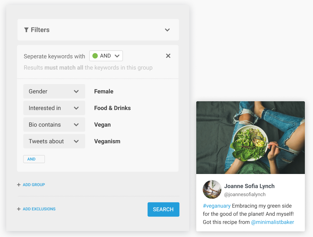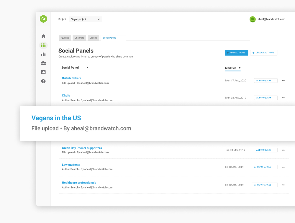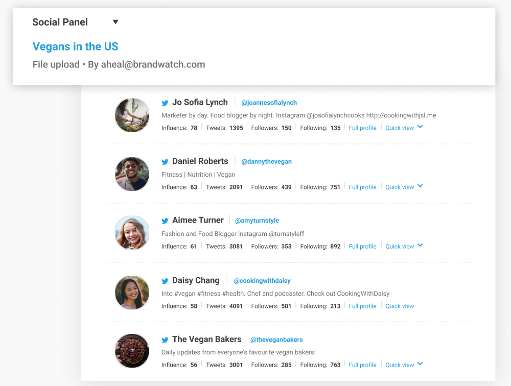 Sie können spezifische Social Panels kreieren, indem Sie eine Liste mit relevanten Nutzern hochladen oder in der größten Datenbank für Online-Gespräche nach den richtigen Konsumenten suchen.