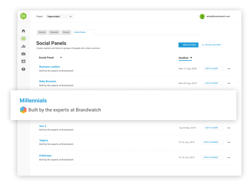 Sie müssen nicht eigens eine der beliebtesten Social Panels selbst kreieren. Starten Sie sofort mit Ready to Use Panels, gebaut von den Experten bei Brandwatch. Erhalten Sie sofort ein tieferes Verständnis über Gruppen wie Millennials oder Baby Boomers mit der Hilfe unseres leistungsstarken Reportings und Analysemöglichkeiten.