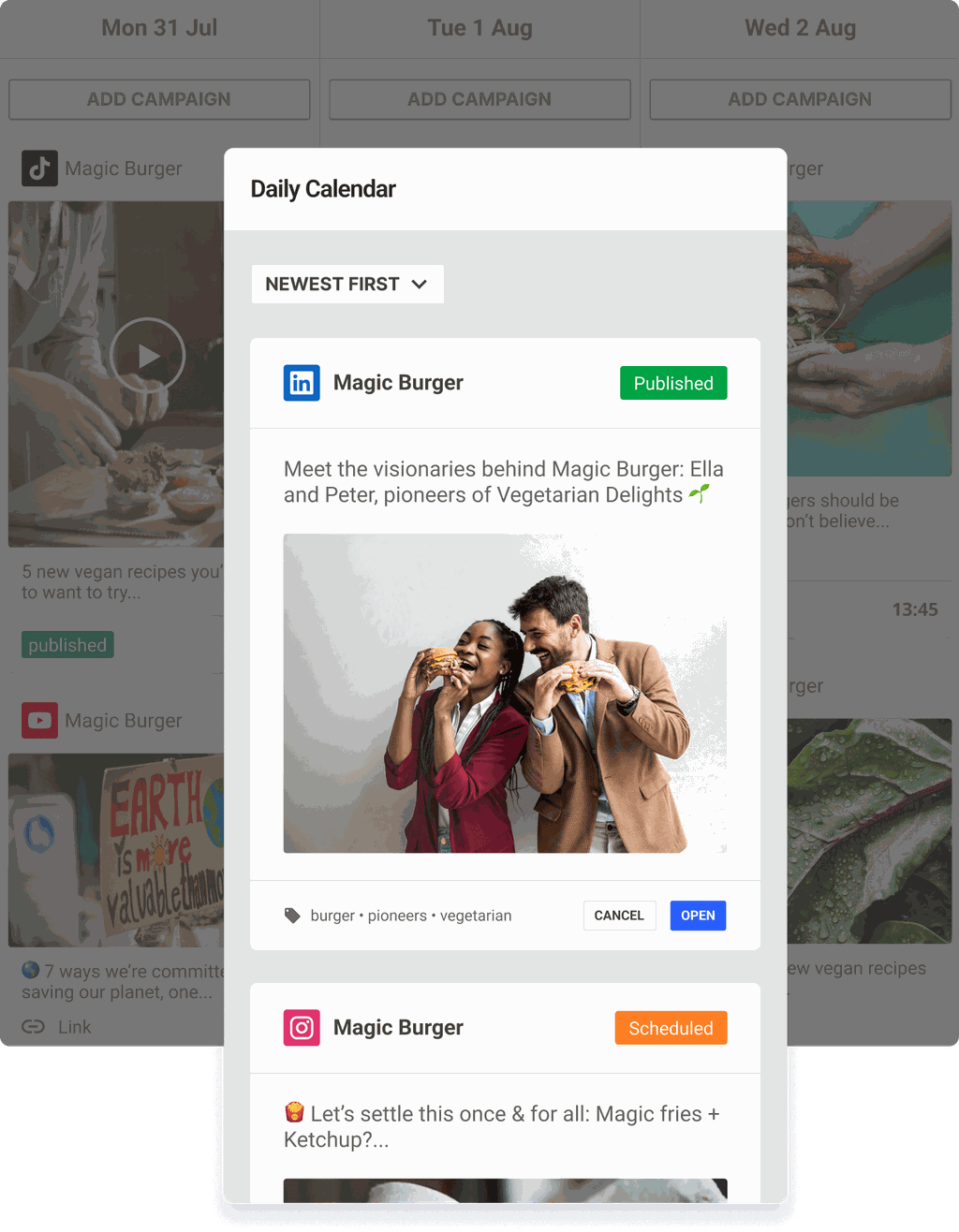 Planen, bearbeiten und veröffentlichen Sie all Ihre Social Media Posts und Kampagnen. Koordinieren Sie jedes Teammitglied und arbeiten an kanalübergreifenden Kampagnen mithilfe von Genehmigungs-Flows zusammen, um die Qualität und Markenkonformität der Inhalte sicherzustellen.