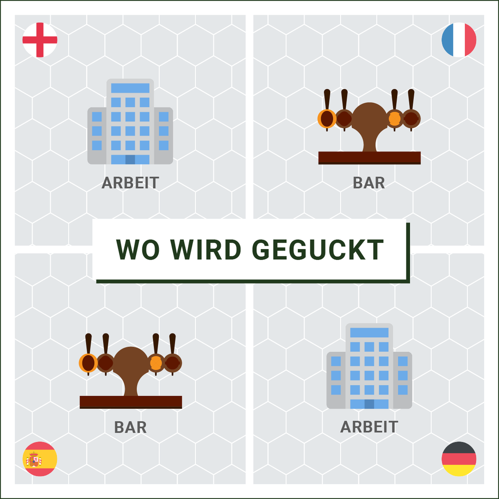 Zu unserer Überraschung haben englische und deutsche Fans nach der Analyse der Tweets am häufigsten am Arbeitsplatz zugesehen. Es scheint, dass die Fußballfans kein Problem damit hatten, die Spiele am Schreibtisch zu sehen und diese Information später auf Twitter zu teilen. Hoffentlich drückt der Chef hier auch beide Augen zu.