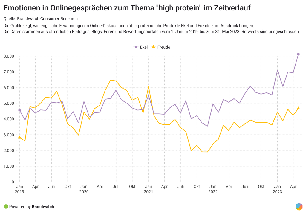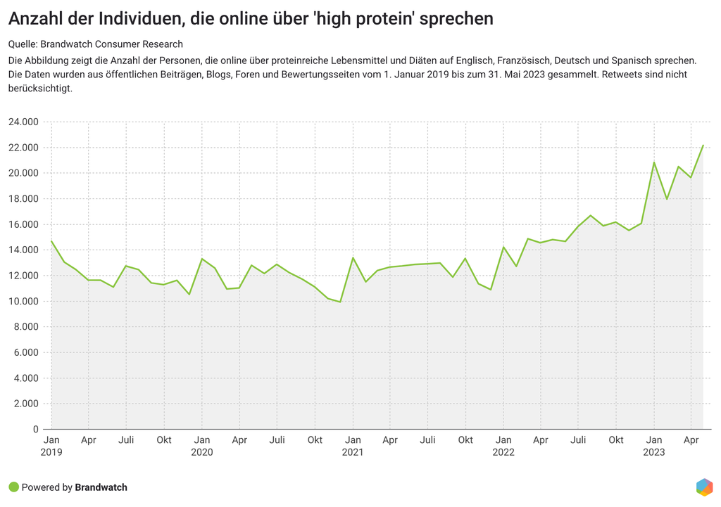 Proteinreiche Produkte sind in den letzten Jahren sehr beliebt geworden und zeigen 2023 keine Anzeichen, dass ihre Beliebtheit nachlässt. Das Suchinteresse nach „hohem Proteingehalt“ erreichte Anfang 2023 ein Fünf-Jahres-Hoch und ist seither hoch geblieben. Die Anzahl der Menschen, die online über hohen Protein- oder Eiweißgehalt sprechen, stieg vom 1. Juni 2022 bis zum 31. Mai 2023 im Vergleich zu den letzten zwölf Monaten um 32 %