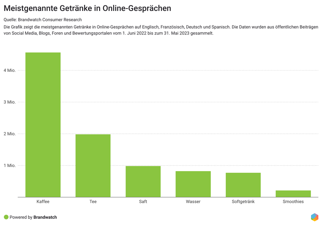 Was trendet in der Getränkewelt ? In Online-Gesprächen über alkoholfreie Getränke ist Kaffee bei weitem das am meisten besprochene Getränk. Tee und Saft stehen an zweiter und dritter Stelle.