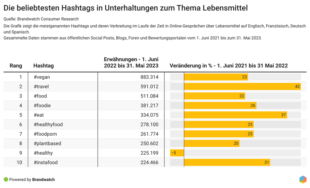 Bei den Hashtags, die in Unterhaltungen über Lebensmittel verwendet werden, steht #vegan ganz oben. Die Top 10 beinhalten Hashtags, die einen gesunden und veganen Lifestyle fördern. Interessanterweise ist der zweitbeliebteste Hashtag Reisen, ein Hashtag, der nicht direkt mit Essen zu tun hat. Es ist auch der Hashtag, dessen Nutzung im analysierten Zeitraum am meisten zunahm. Das sind pandemiebedingte Auswirkungen, da Verbraucher:innen 2021 selbstverständlich nicht viel reisen konnten. Dies hat sich 2022 geändert, und wir konnten viel mehr Social Media Posts zu Essen und Reisen beobachten.