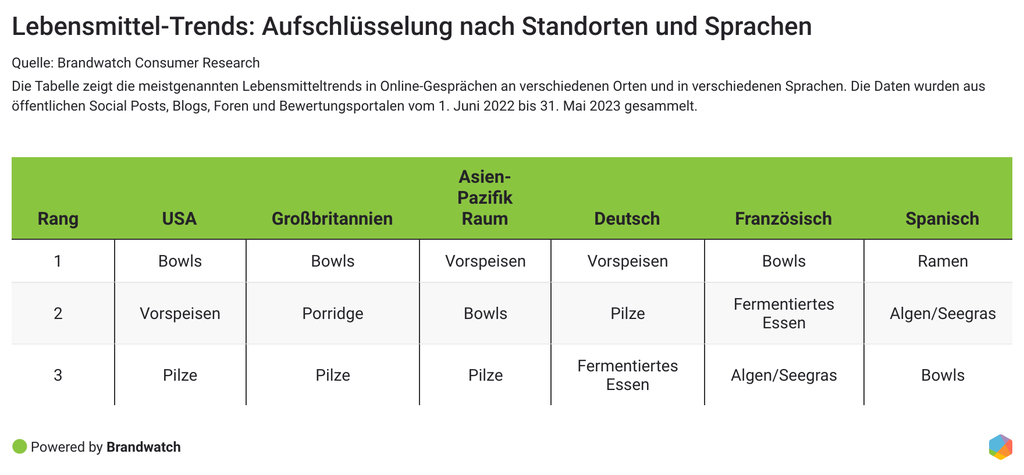 Während Bowls in den USA, im Vereinigten Königreich und den französischsprachigen Ländern der Top-Food-Trend in den Online-Gesprächen der Verbraucher:innen sind, stehen in den deutschsprachigen und APAC-Ländern Vorspeisen an erster Stelle. Ramen ist in spanischsprachigen Ländern ein Favorit, und Verbraucher:innen im Vereinigten Königreich sprechen mehr über Porridge als in anderen Ländern, was es zum am zweithäufigsten diskutierten Food-Trend in ihren Gesprächen macht.