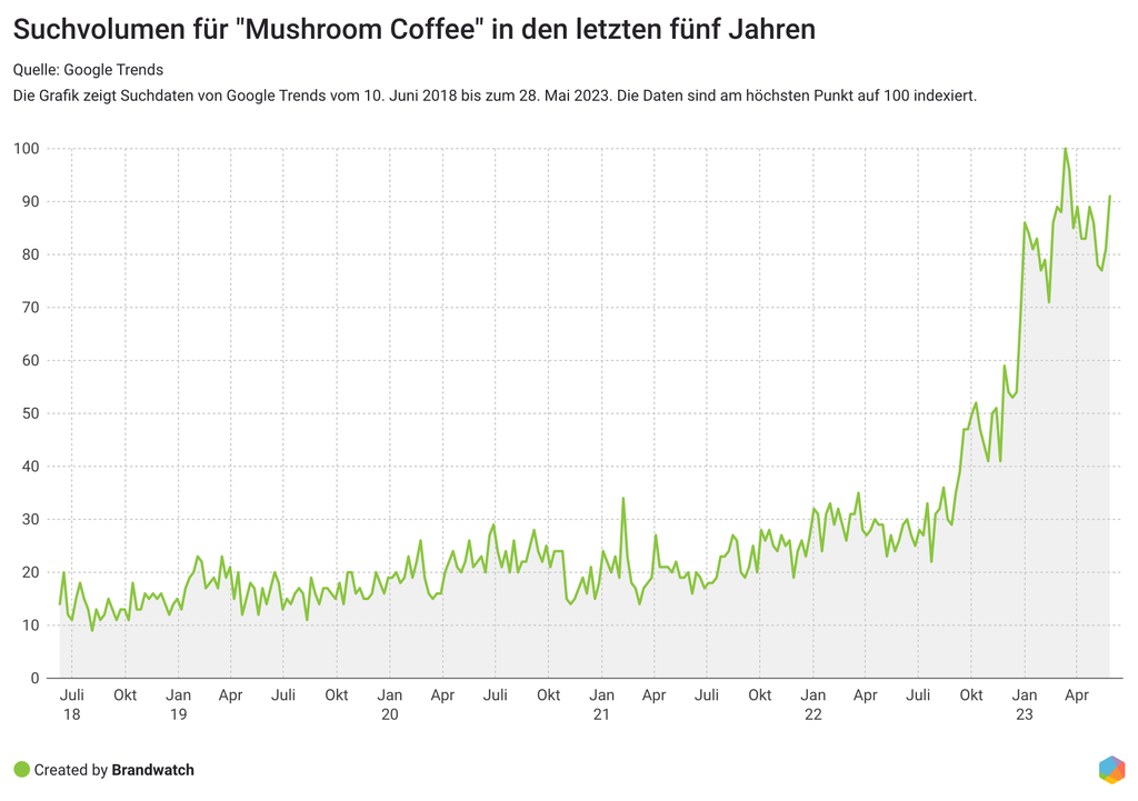 Ein weiterer Trend, der in letzter Zeit in den Vordergrund gerückt ist, ist Pilzkaffee. Verbraucher wechseln von normalem Kaffee zu Pilzkaffee, um etwas Neues auszuprobieren oder den gesundheitlichen Nutzen zu genießen. Laut Google Trends stieg das Suchinteresse nach Pilzkaffee Ende 2022 und erreichte im März 2023 ein Fünf-Jahres-Hoch.