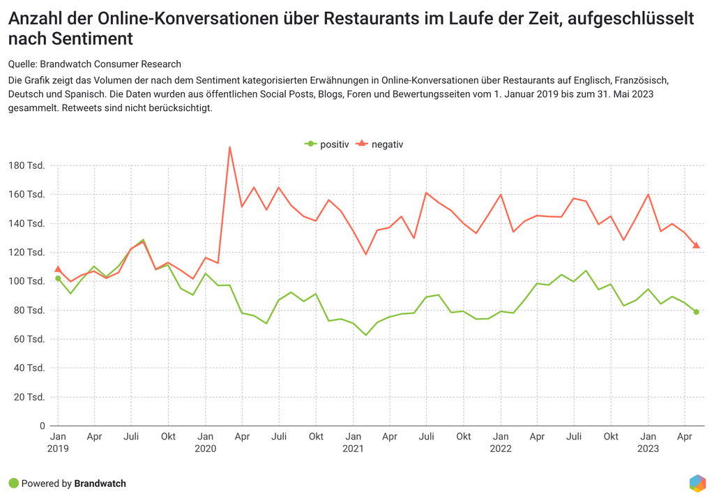Online-Gespräche über Restaurants und Essengehen gingen vom 1. Juni 2022 bis zum 31. Mai 2023 im Vergleich zu den letzten 12 Monaten um 33 % zurück. Mit Blick auf die Stimmung gingen positive Erwähnungen noch stärker zurück. Im selben Zeitraum gingen die positiven Erwähnungen um fast 50 % zurück. Zu Beginn der Pandemie hat sich die Kluft zwischen negativen und positiven Erwähnungen vergrößert, und obwohl sie sich 2022 wieder verkleinert hat, weist sie im Vergleich zu 2019 immer noch eine größere Spaltung auf.