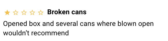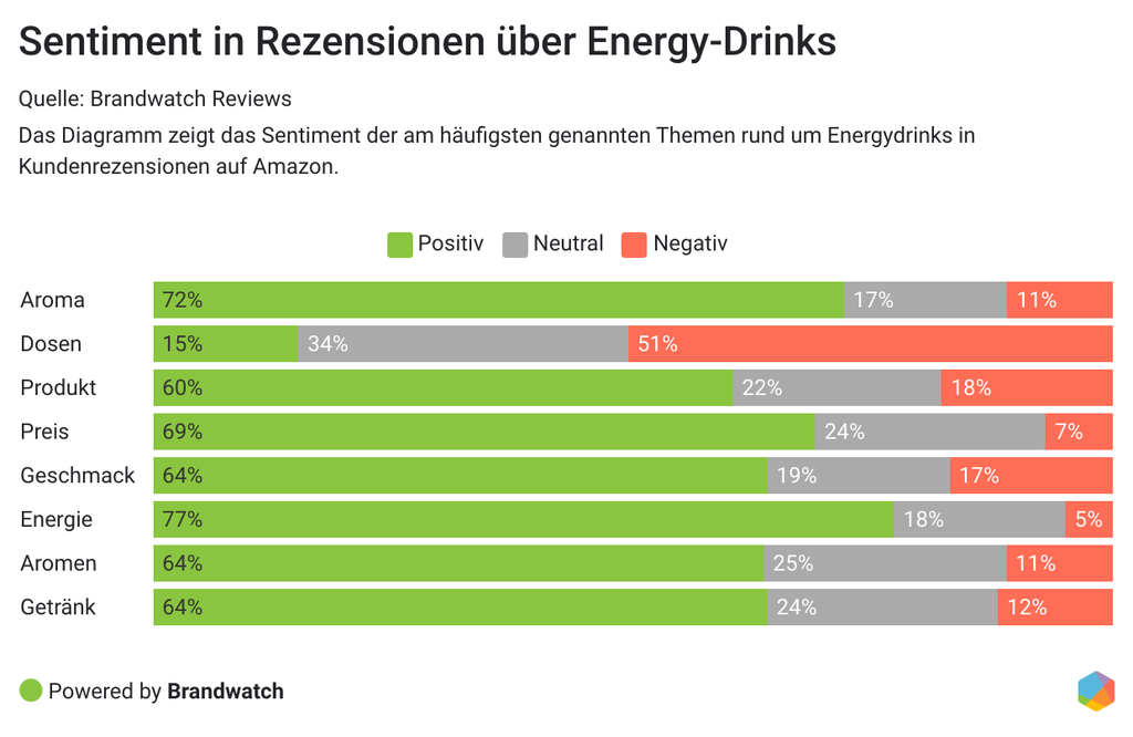 Verbraucher loben Energy Drinks, wenn ihre Erwartungen erfüllt oder übertroffen werden. Andere positive Themen sind Geschmack und Preis. Interessanterweise sind Bewertungen, die „Dosen“ erwähnen, über 50 % negativ. Verbraucher, die Dosen in ihren Bewertungen erwähnen, beschweren sich über schlechte Verpackung und während des Transports beschädigte Dosen. Andere sagen, dass der Karton Dosen, den sie bestellt haben, den Preis nicht wert war. Negative Erfahrungen mit dem Versand und beschädigten Produkten können Verbraucher:innen zu anderen Marken führen und andere Verbraucher:innen vom Kauf abhalten.