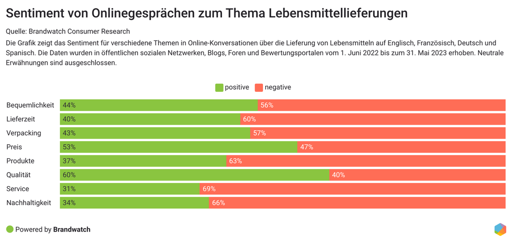 In Online-Gesprächen sprechen Verbraucher:innen darüber, Lebensmittel online zu bestellen, weil sie nicht das Gefühl haben, dass sie genug Zeit zum Einkaufen haben. Arbeit bestimmt einen Großteil der Gespräche, und sie sagen, dass Lieferdienste ihr Leben erleichtern. Aber Geld ist eines der Hauptthemen in den negativen Gesprächen. Höhere Preise und höhere Liefergebühren bewirken bei vielen Verbrauchern ein Umdenken, und preissensible Verbraucher überdenken ihre Einkaufsgewohnheiten.