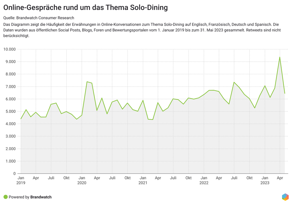 Vom 1. Juni 2022 bis zum 31. Mai 2023 stieg die Anzahl der Menschen, die online über allein essen und Solo-Dining sprachen, im Vergleich zu den letzten 12 Monaten um 7 % und die Anzahl der Online-Erwähnungen stieg um 9 %. Mit Blick auf die verschiedenen Regionen zeichnen sich einige Unterschiede ab: Während die Zahl der deutsch- und französischsprachigen Menschen, die über allein essen sprechen, zugenommen hat, sprechen in den APAC-Ländern weniger Menschen über das Thema.
