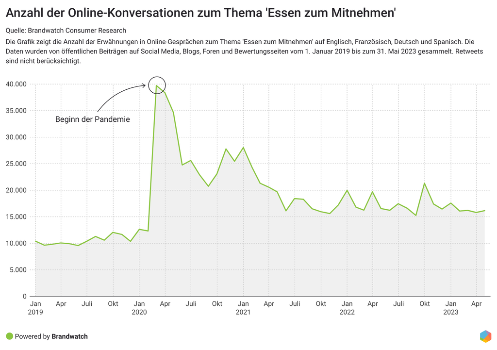 Trotz der Auswirkungen der steigenden Lebenshaltungskosten auf das Budget vieler Menschen werden Essen-to-go-Bestellungen immer noch mehr besprochen als vor der Pandemie. Nach dem enormen Zuwachs 2020 bleiben Online-Gespräche 2023 weiter auf einem höheren Niveau als 2019.