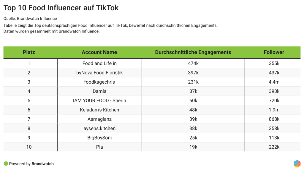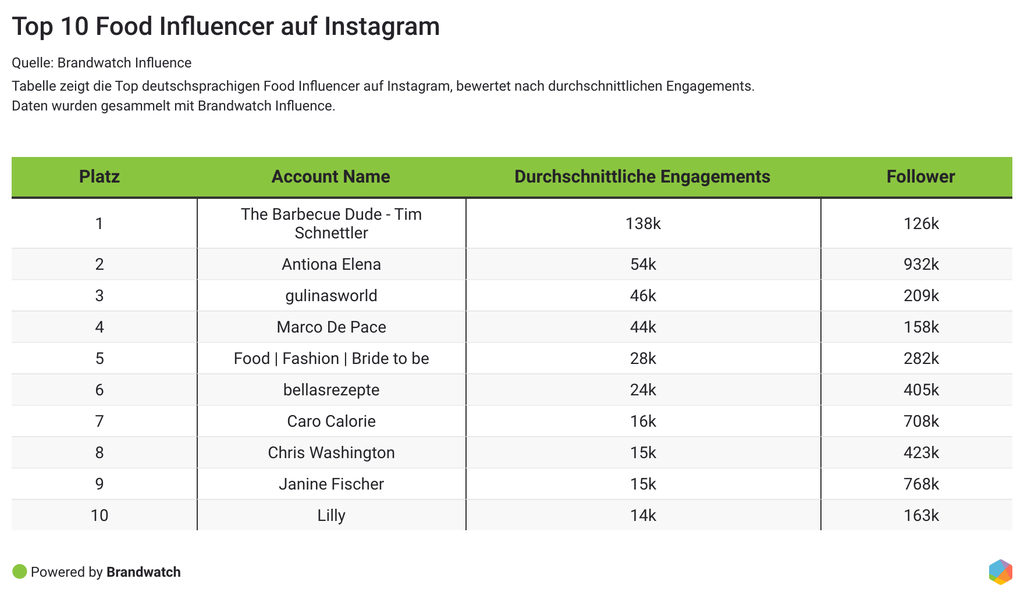 Hier sind die Top 10 Food-Influencer auf Instagram und TikTok, geordnet nach durchschnittlichen Engagements: