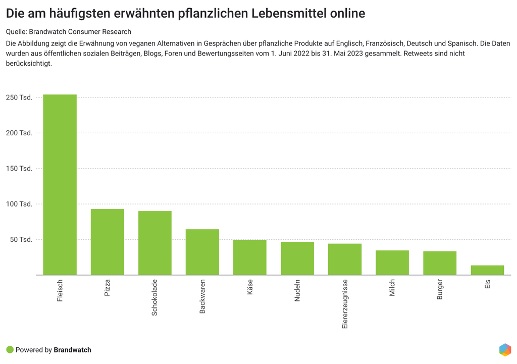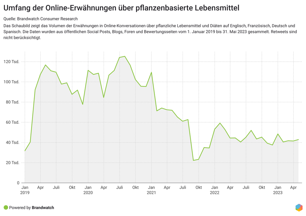 Online-Gespräche über pflanzliche Lebensmittel sind vom 1. Juni 2022 bis zum 31. Mai 2023 im Vergleich zu den letzten 12 Monaten insgesamt um 7 % gesunken.