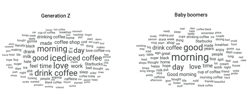 Babyboomer besprechen, dass sie ihren Kaffee schwarz oder mit Zucker oder Milch trinken. Die Generation Z bevorzugt Eiskaffee und spricht eher über den Besuch von Cafés. Sie sprechen auch viel negativer über das Thema als Babyboomer. Von den stimmungsbedingten Kaffee-Erwähnungen der Generation Z sind 50 % negativ, während nur 31 % der Kaffee-Gespräche der Babyboomer negativ sind. Personen der Generation Z sprechen eher darüber, dass sie Kaffee nicht mögen oder Schlafprobleme haben und deshalb nur morgens Kaffee trinken können.