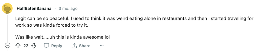 Andere haben eine weniger positive Erfahrung gemacht, was zu den negativen Gesprächen beiträgt, in denen sie thematisieren, wie unangenehm es ist und wie unwohl sie sich fühlen, alleine in einem Restaurant zu essen, oder dass sie sich unsicher sind, wo sie sitzen sollen, wenn das Restaurant keine Bar hat. Tatsächlich stiegen die negativen Erwähnungen von Solo-Dining um 24 %, was darauf hindeutet, dass die Erfahrung von Solo-Dining nicht den Erwartungen entspricht.