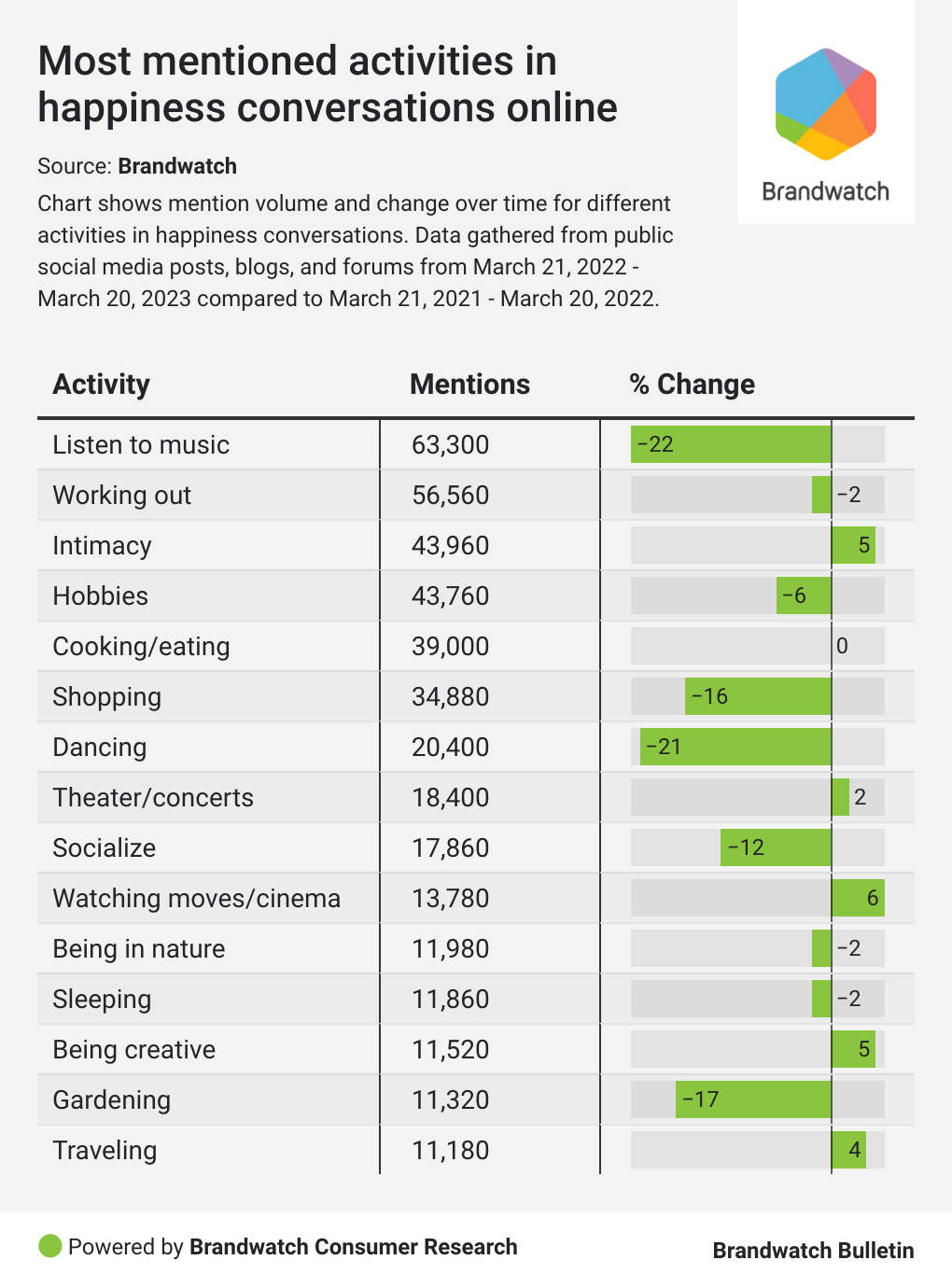 How do people talk about happiness and activities online? We analyzed online conversations such as “makes me happy,” “my happiness,” or “I’m happy” and broke the mentions down into the most mentioned activities.