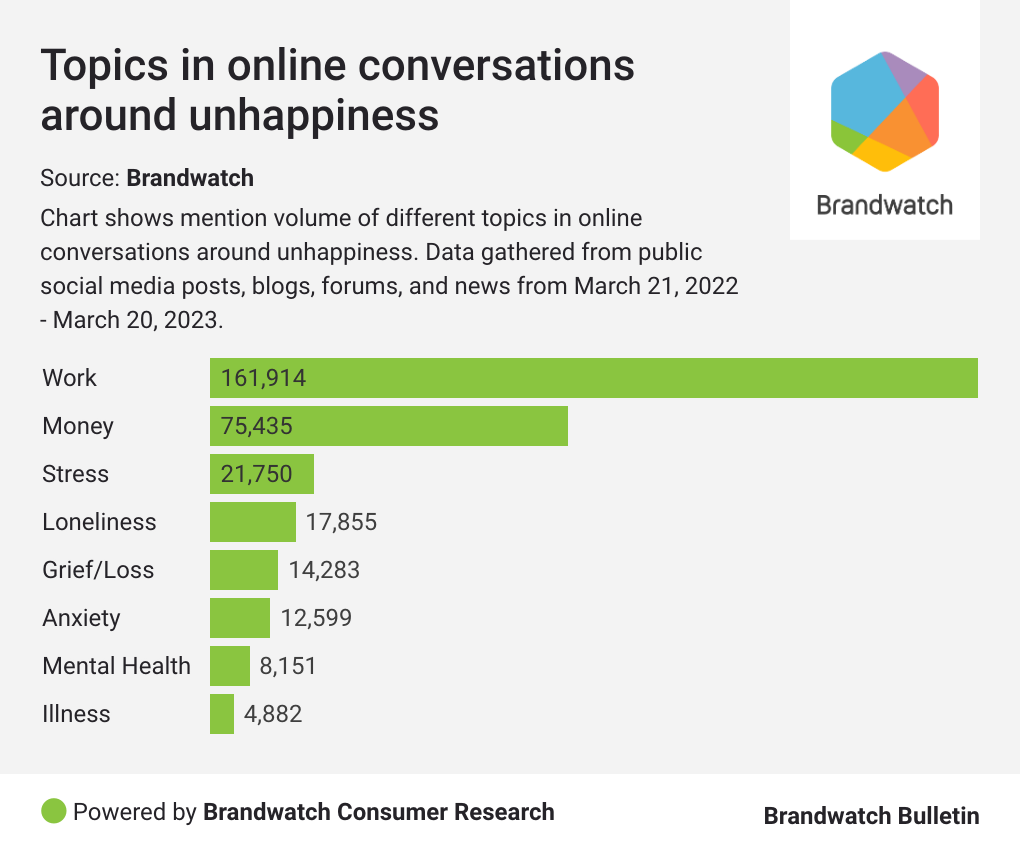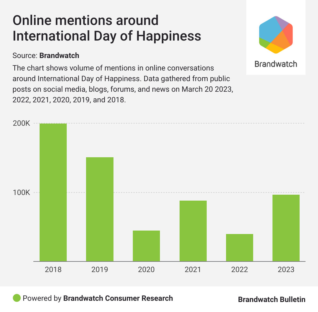 While the mentions this year didn’t reach pre-pandemic volumes, they did surpass those of recent years. With the COVID-19 pandemic hitting in 2020 and the war in Ukraine starting in 2022, it’s not all that surprising that people might not have been in the mood to discuss happiness online at the time.