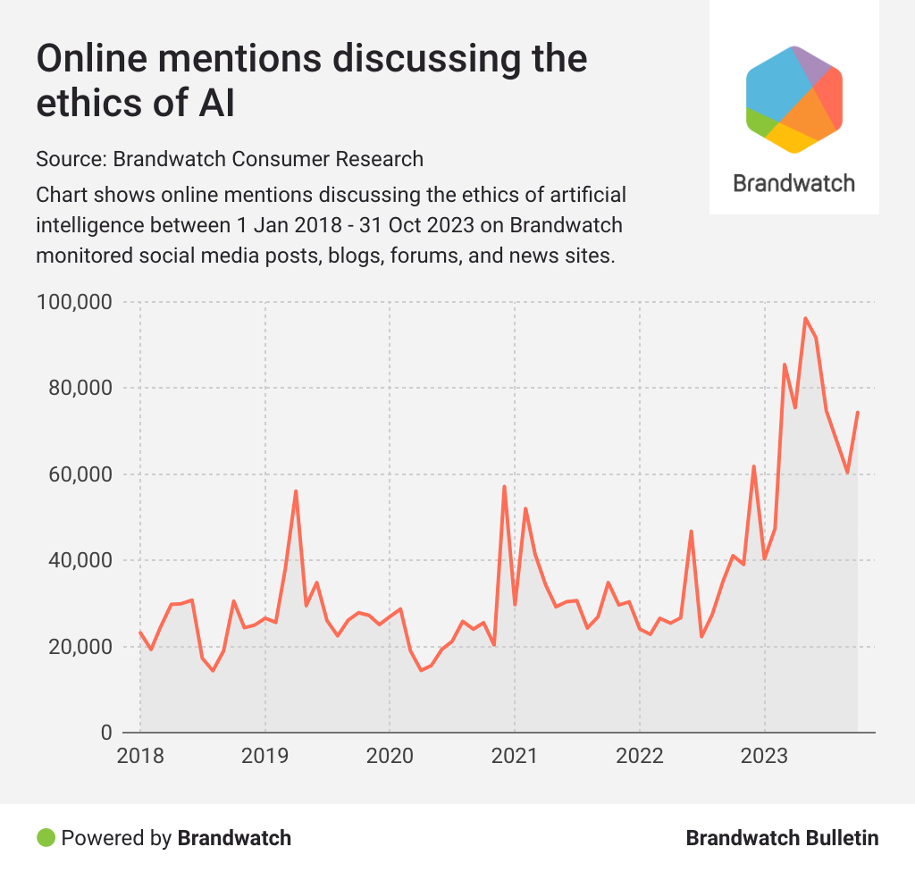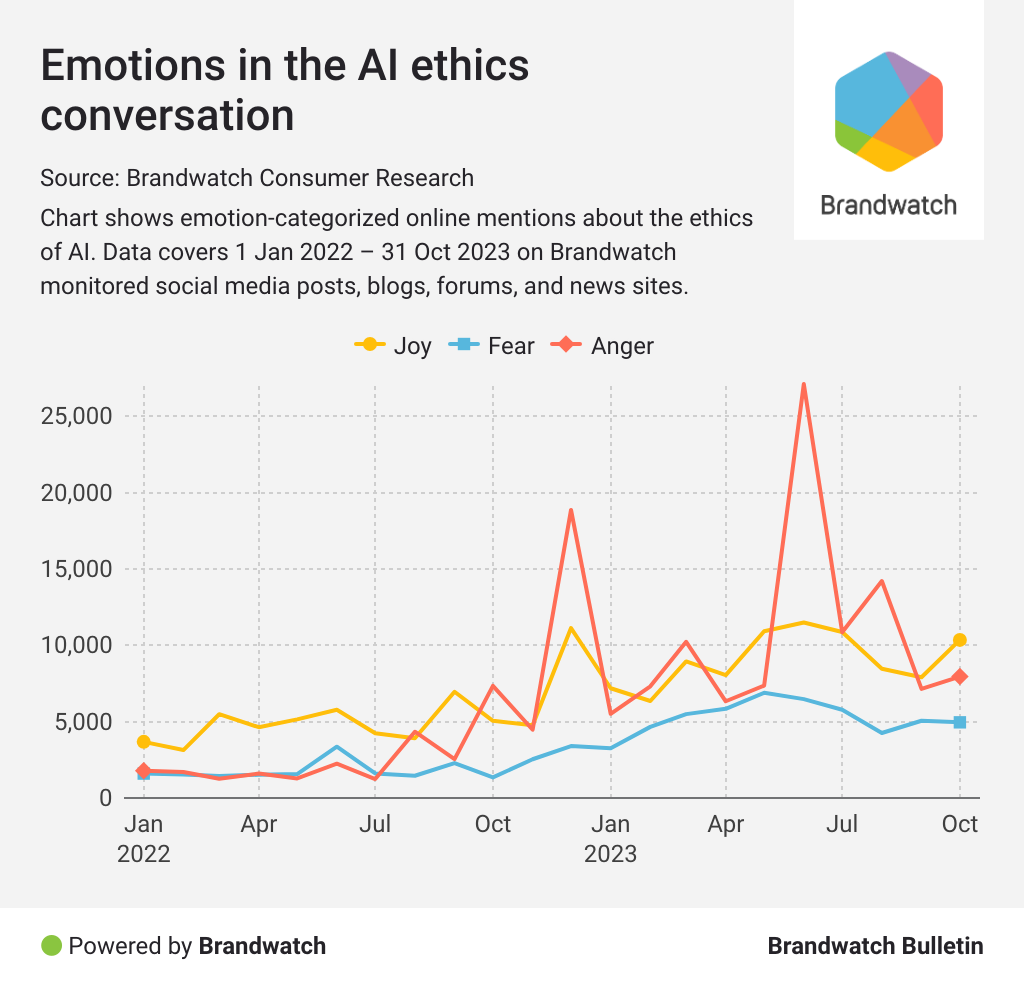 Among the mentions expressing concerns about AI, consumers are debating how it should be implemented and monitored. It’s clear that brands using AI in unethical ways face public criticism, so it’s important to get it right.