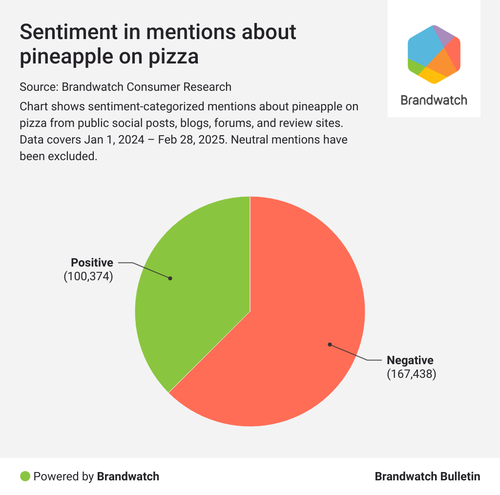 When diving into the sentiment on this topic, a large 61% of online mentions conversation were negative – almost two thirds of users expressed distaste for the topping.