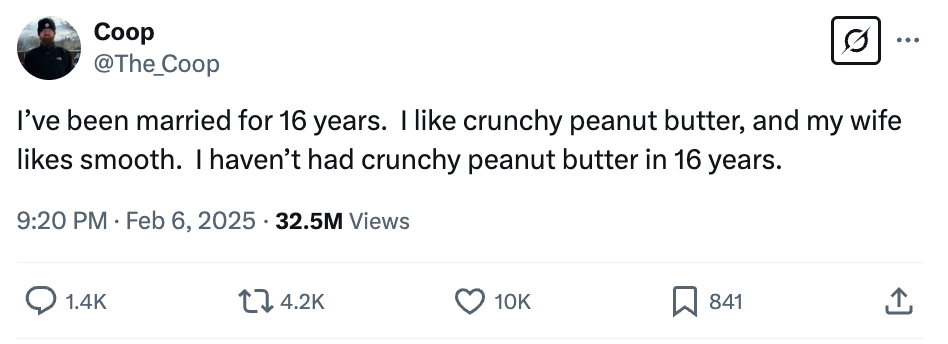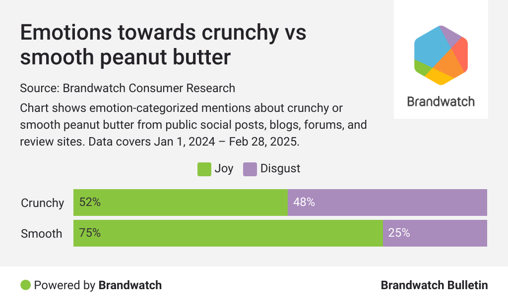 People are much more likely to express joy in posts about smooth peanut butter. But that doesn’t mean the debate is over – 3,500 individuals chime into this conversation every month.