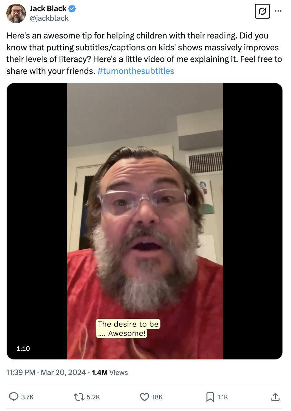 The biggest topic was all about accessibility: subtitles banish language barriers, enhance comprehension, and even help with literacy levels in children. Jack Black even became a proponent in this conversation – posting on X about how subtitles are important for children’s development.