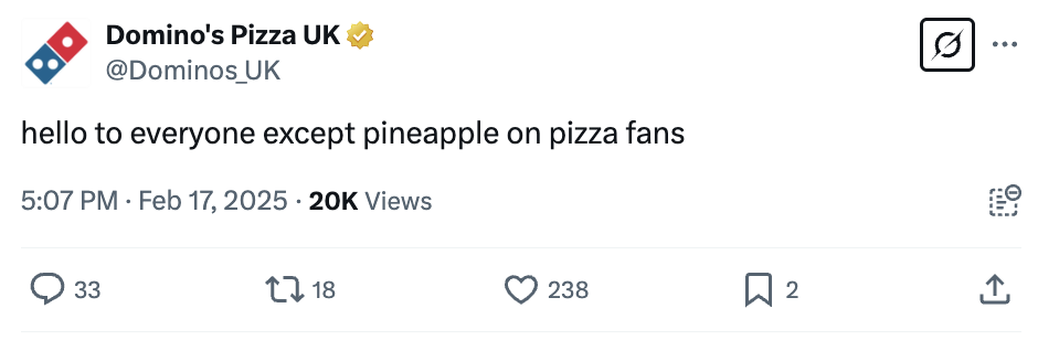 And if you prefer your pizza sweet, don’t worry – the minority still puts up a fight. (However, maybe skip following Domino’s UK on X).