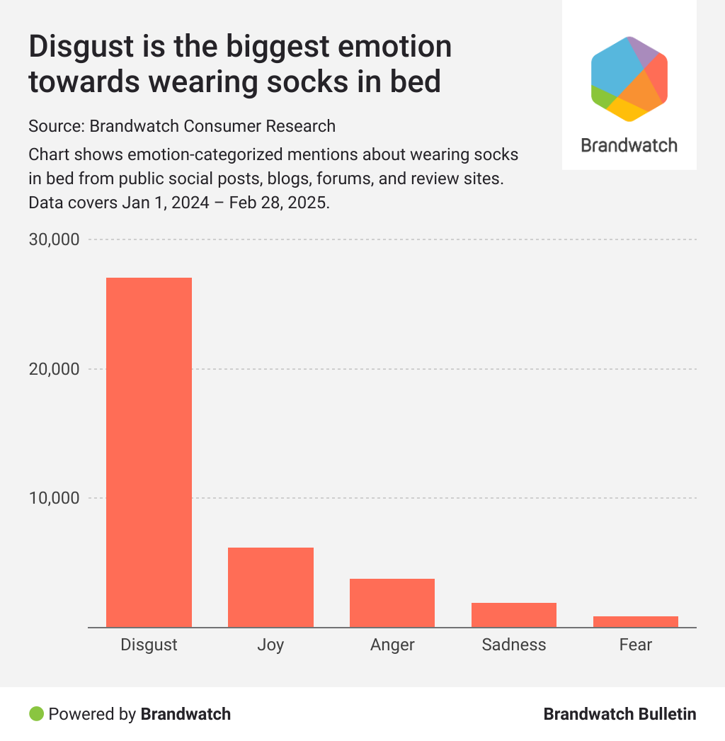 Well, online, opinion is pretty straightforward – socks in bed are a huge no-no. 68% of emotion-categorized mentions showed disgust.