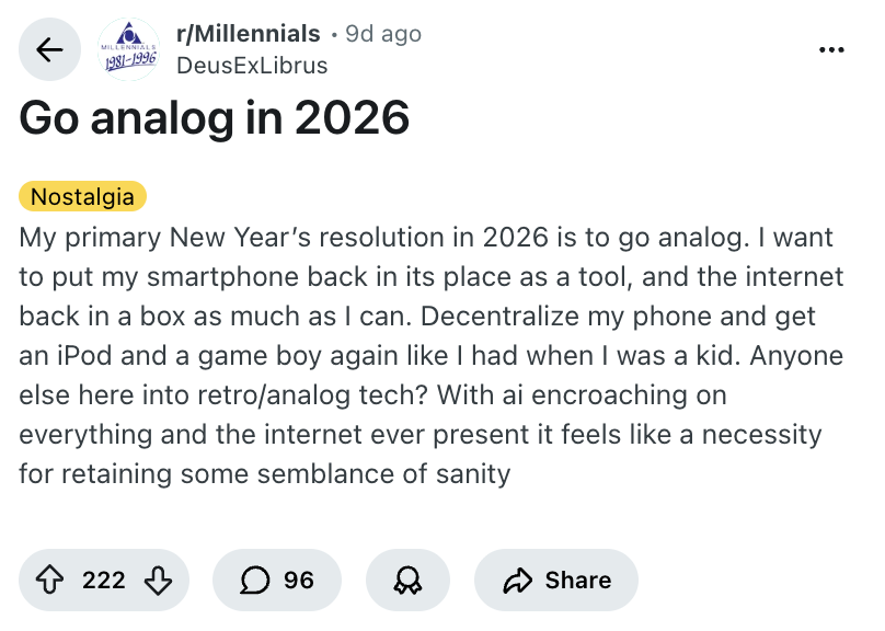 This tension helps explain the rise of the “going analog” trend, too. People are sharing plans to cut back on screens through physical habits and offline alternatives.