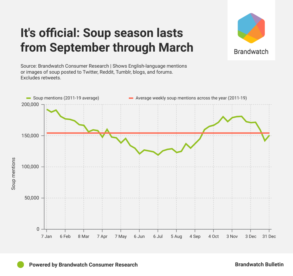 You’ll use this figure as a baseline to see when your topic is being discussed above or below average. From there you can mark out your topic’s seasonality.
