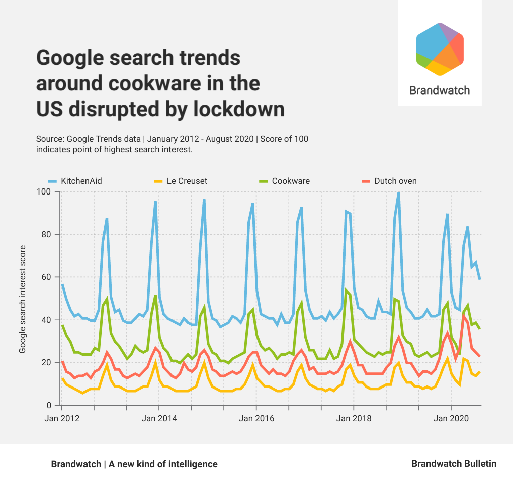 As mentioned above, Google searches around popular brands and items see a seasonal spike every December. In 2020, the pattern seems to have been disrupted with unseasonal interest around May.